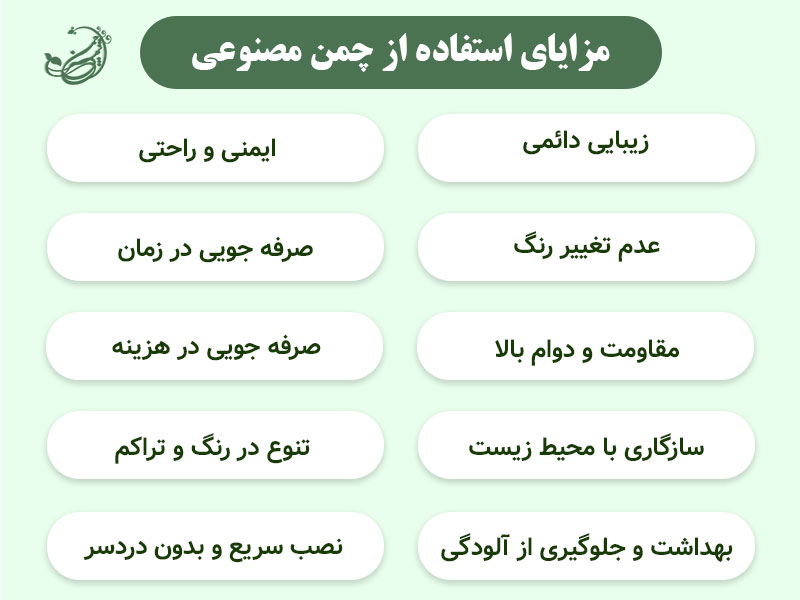 - عدم نیاز به نگهداری مستمر: برخلاف چمن طبیعی، نیازی به آبیاری، چمن زنی و کوددهی ندارد.
